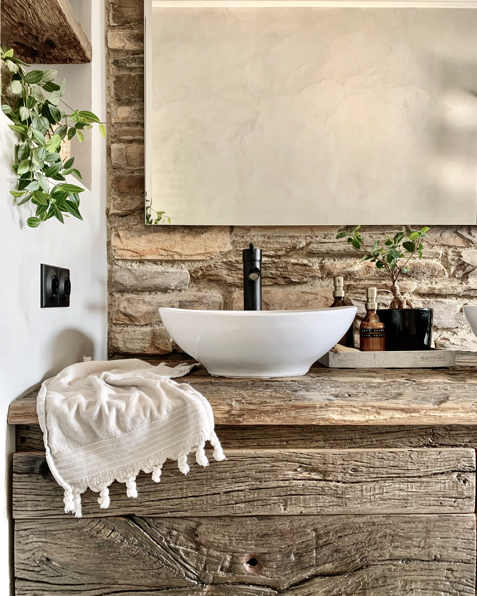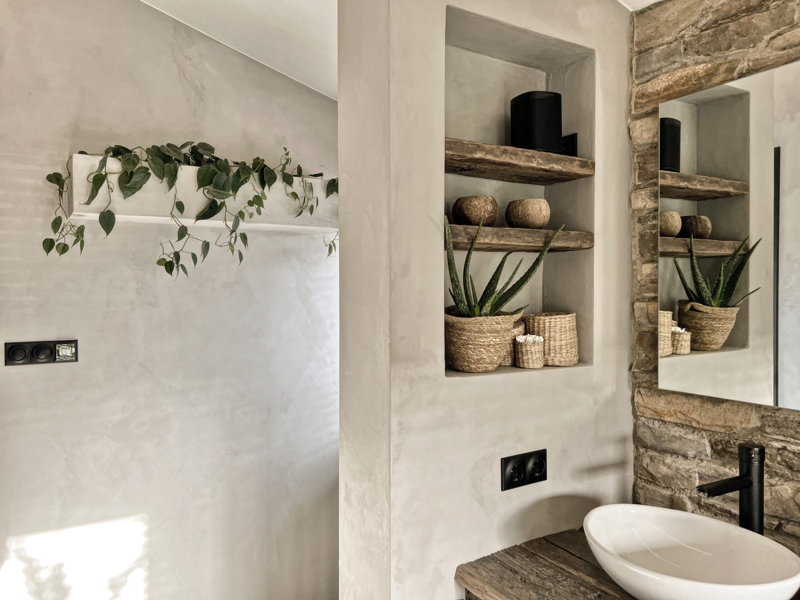 Onze badkamer is smal maar lang en daarom wilden we, vanwege de stenen muur de rest wel heel rustig houden. Die wand moest een eyecatcher worden en de rest vooral mee blenden. Tegels vonden we minder mooi tegenover het contrast…